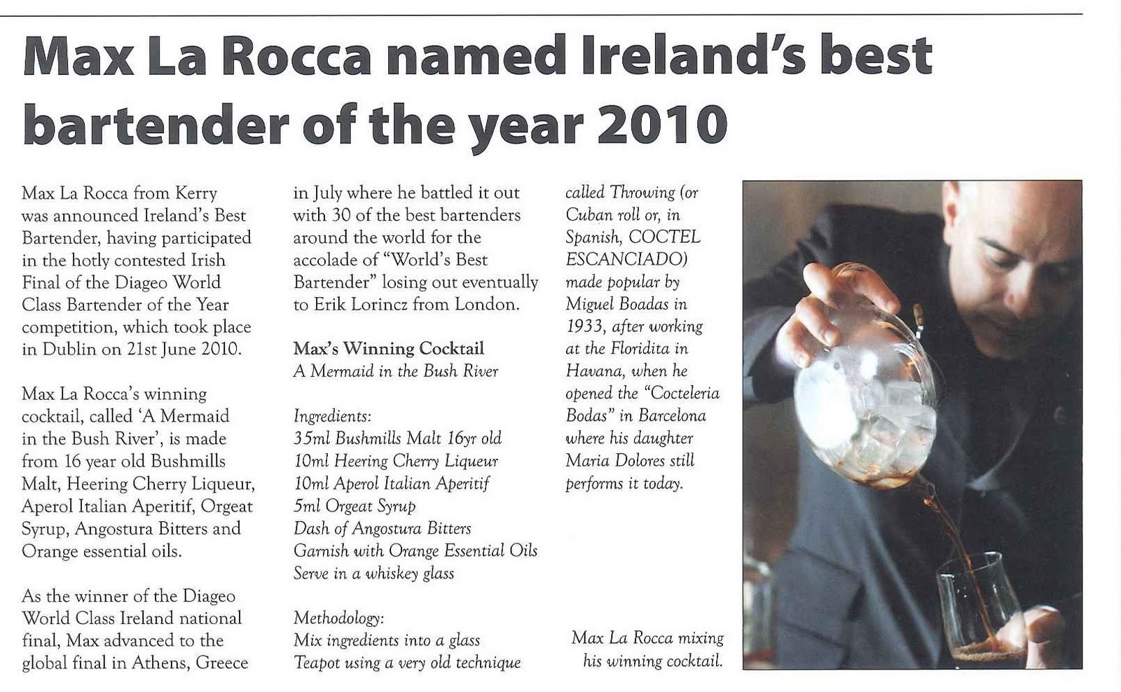 Max La Rocca was judged as the most creative and entertaining bartender in Ireland and been crowned with the prestigious title of ” Ireland’s WORLD CLASS Bartender of the Year”